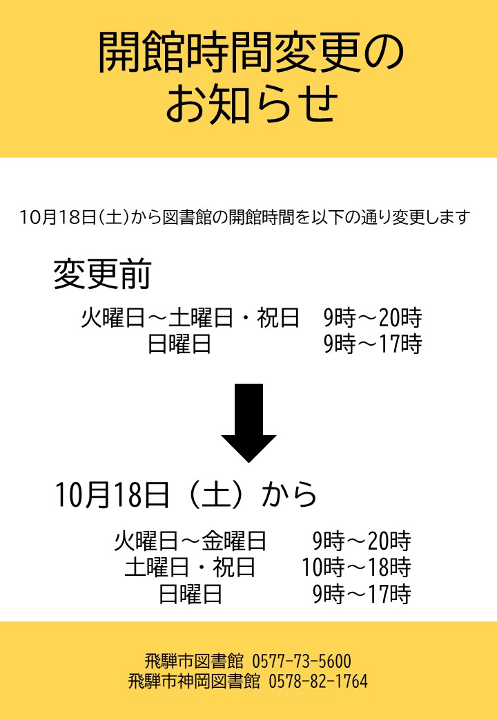 飛騨市図書館・神岡図書館の開館時間を10月18日から12月末まで変更します。