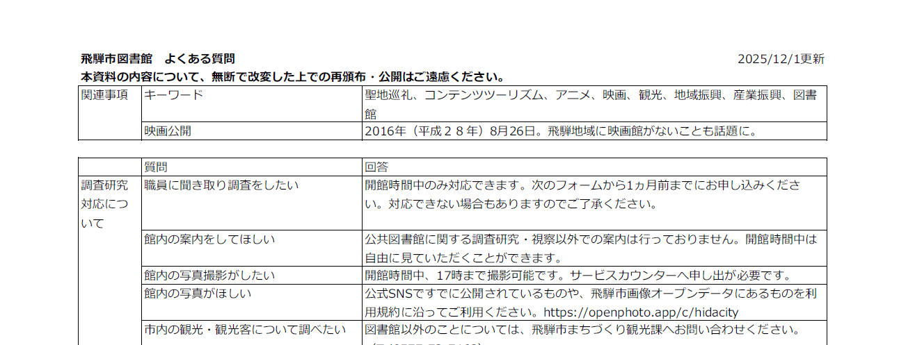 飛騨市図書館で、コンテンツツーリズムや観光等をテーマに調査研究を行いたい方は、以下のフォームから調査依頼を申請してください。