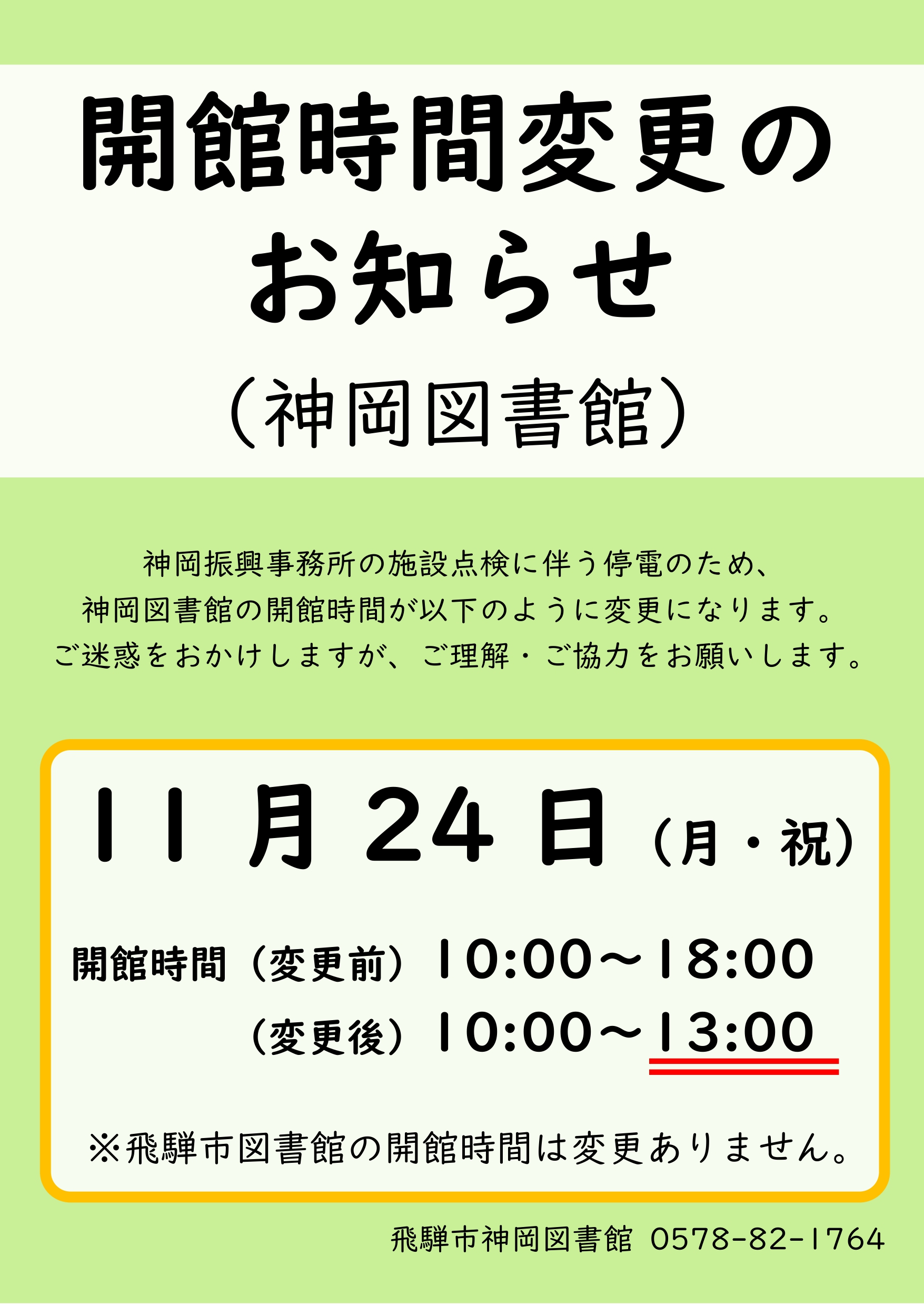 開館時間変更のお知らせ(神岡図書館)