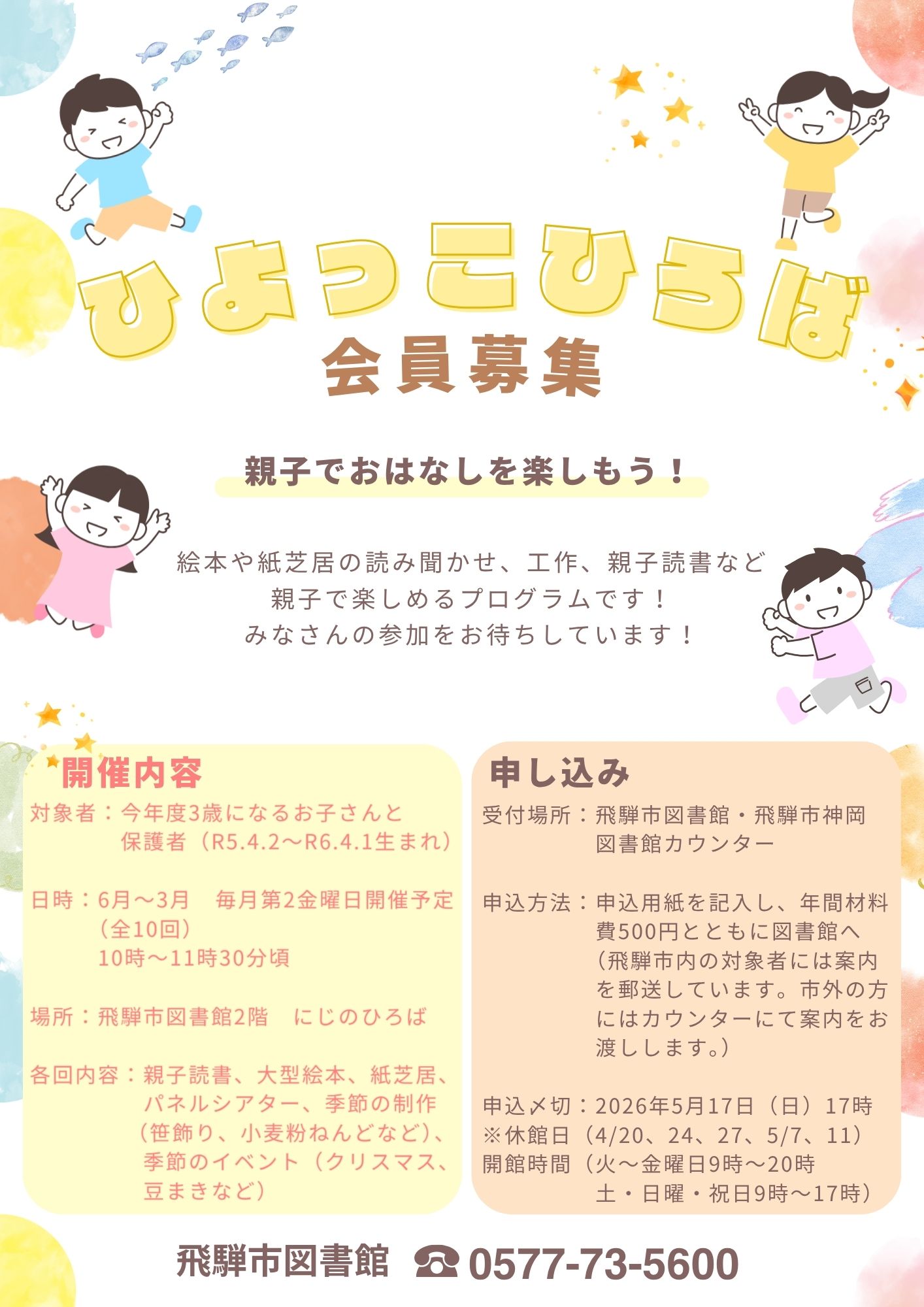 今年度3歳になるお子さんを対象としたおはなし会「ひよっこひろば」の会員を募集します。